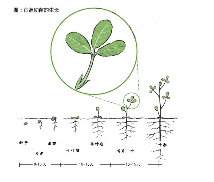 從上圖可以清楚的看到,苜蓿生長(zhǎng)到三葉期之前,都是靠在“地下世界”的生活能力所決定的。也就是說,在這之前苜蓿能否發(fā)育正常,健康生長(zhǎng),不僅僅要靠她本身種子的抗逆的遺傳性,更大的取決于地下根部周邊環(huán)境的好與壞。 因?yàn)樵谌~期之前,苜蓿的光合作用是及其微弱的。95%以上的能量或者生存的能力,要靠種子本身對(duì)地下環(huán)境的適應(yīng)。這個(gè)期間需要的時(shí)間是30-40天。